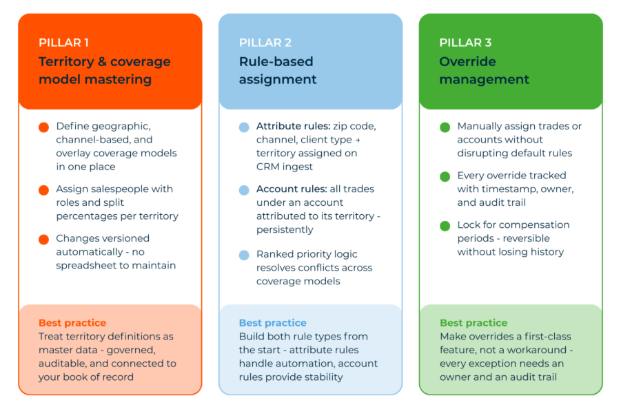 Regardless of firm size or distribution model, effective territory management rests on three capabilities: entity mastering, rule-based assignment, and override management. Getting all three right is what separates firms with accurate, scalable attribution from those still running on spreadsheets and institutional memory.