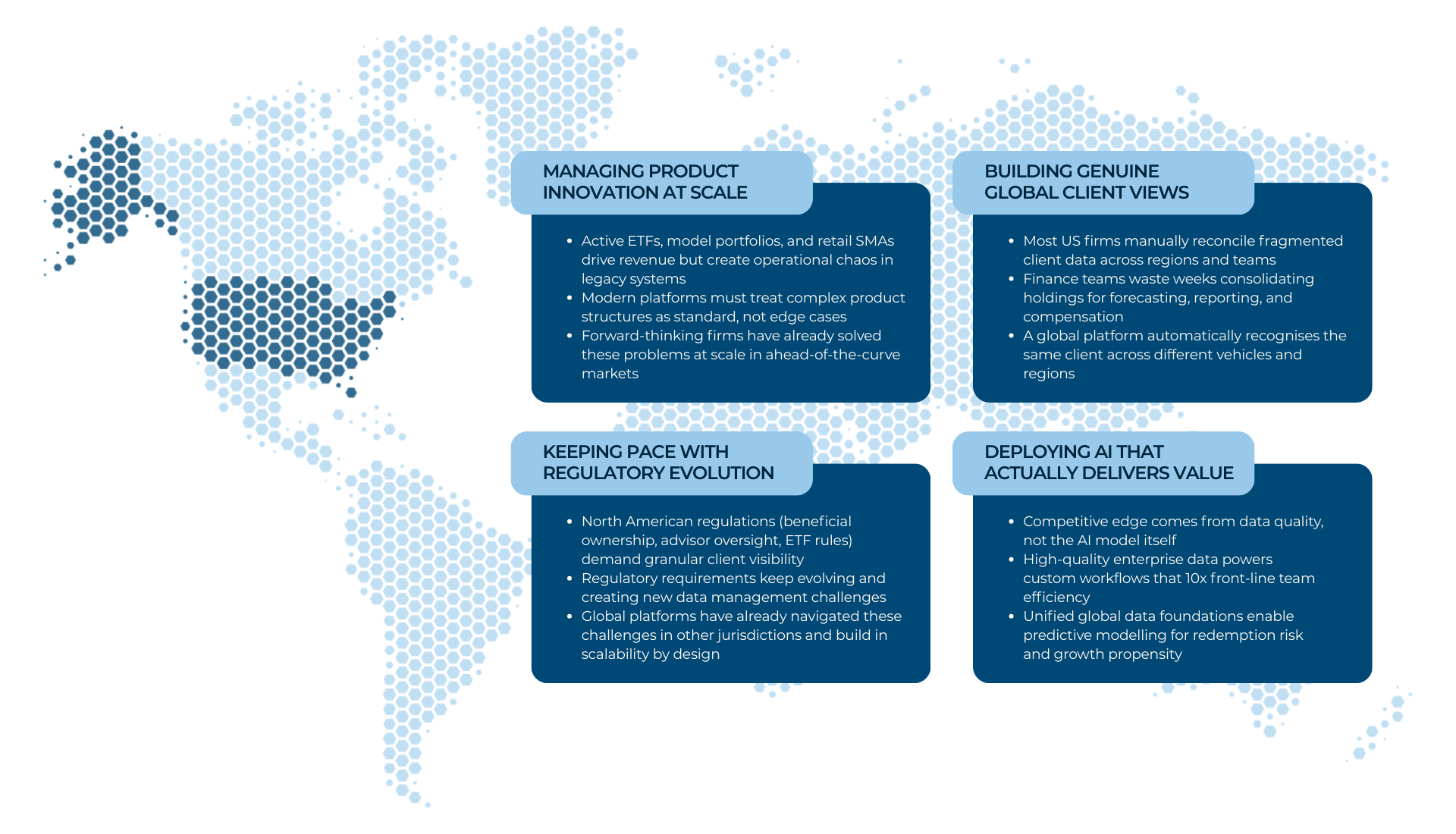 The evolution of asset management in North America has created a fundamental challenge that legacy systems simply cannot solve: the need for genuinely global client data infrastructure that operates seamlessly across markets, vehicles, and channels whilst maintaining the sophistication required by today's most complex distribution networks.
